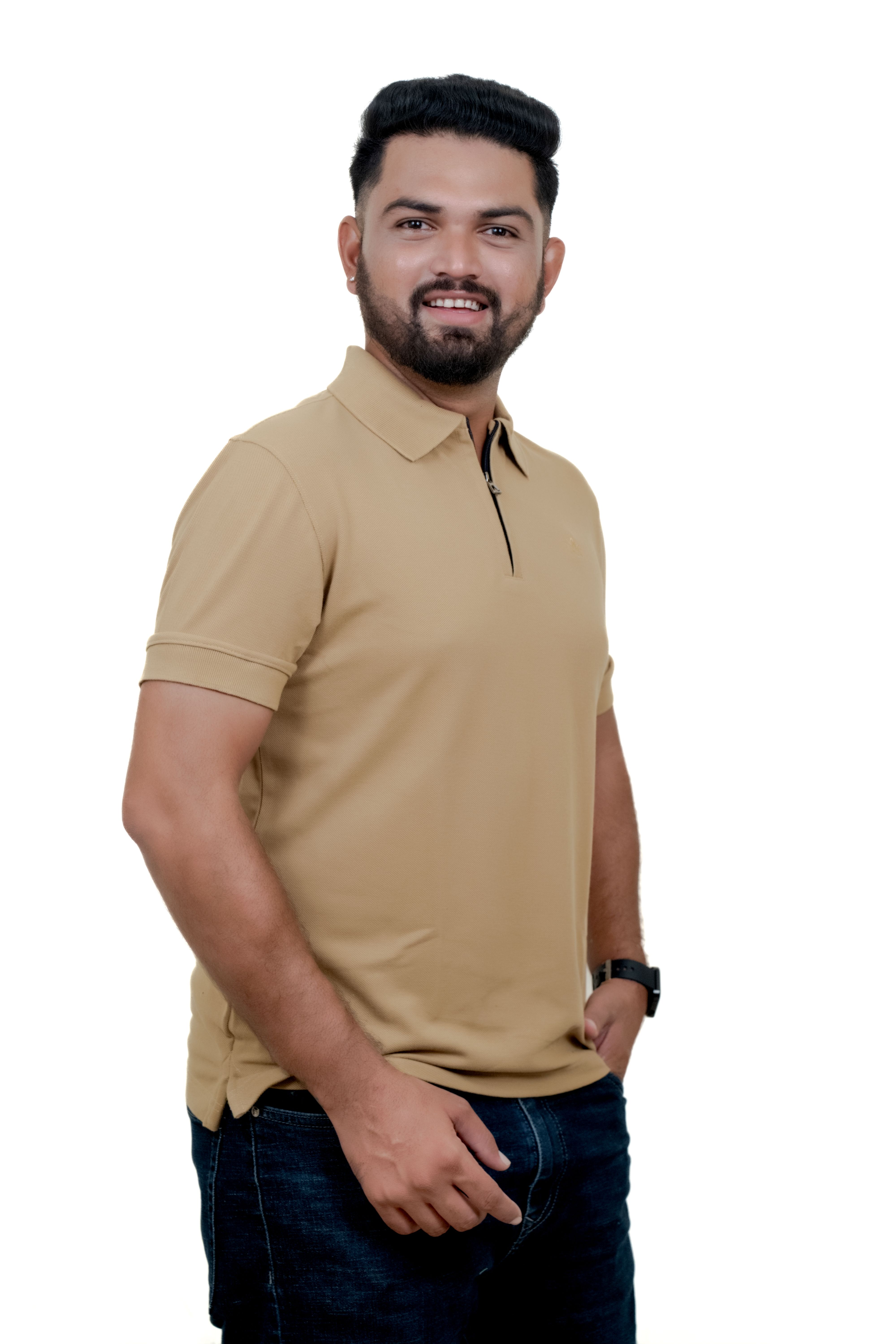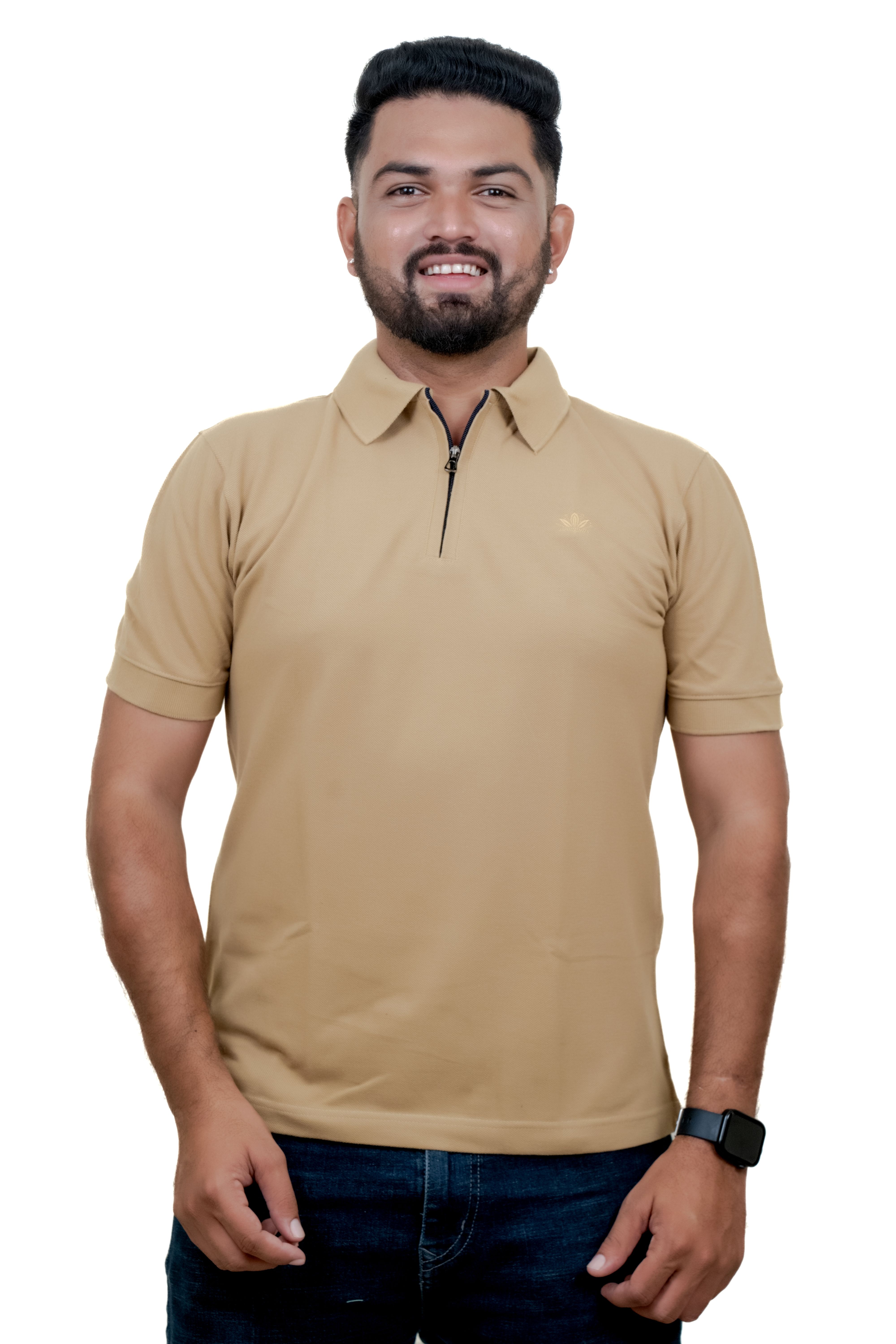 Stay stylish and confident in this camel brown polo t-shirt with a sleek zip collar and classic short sleeves – perfect for everyday wear.