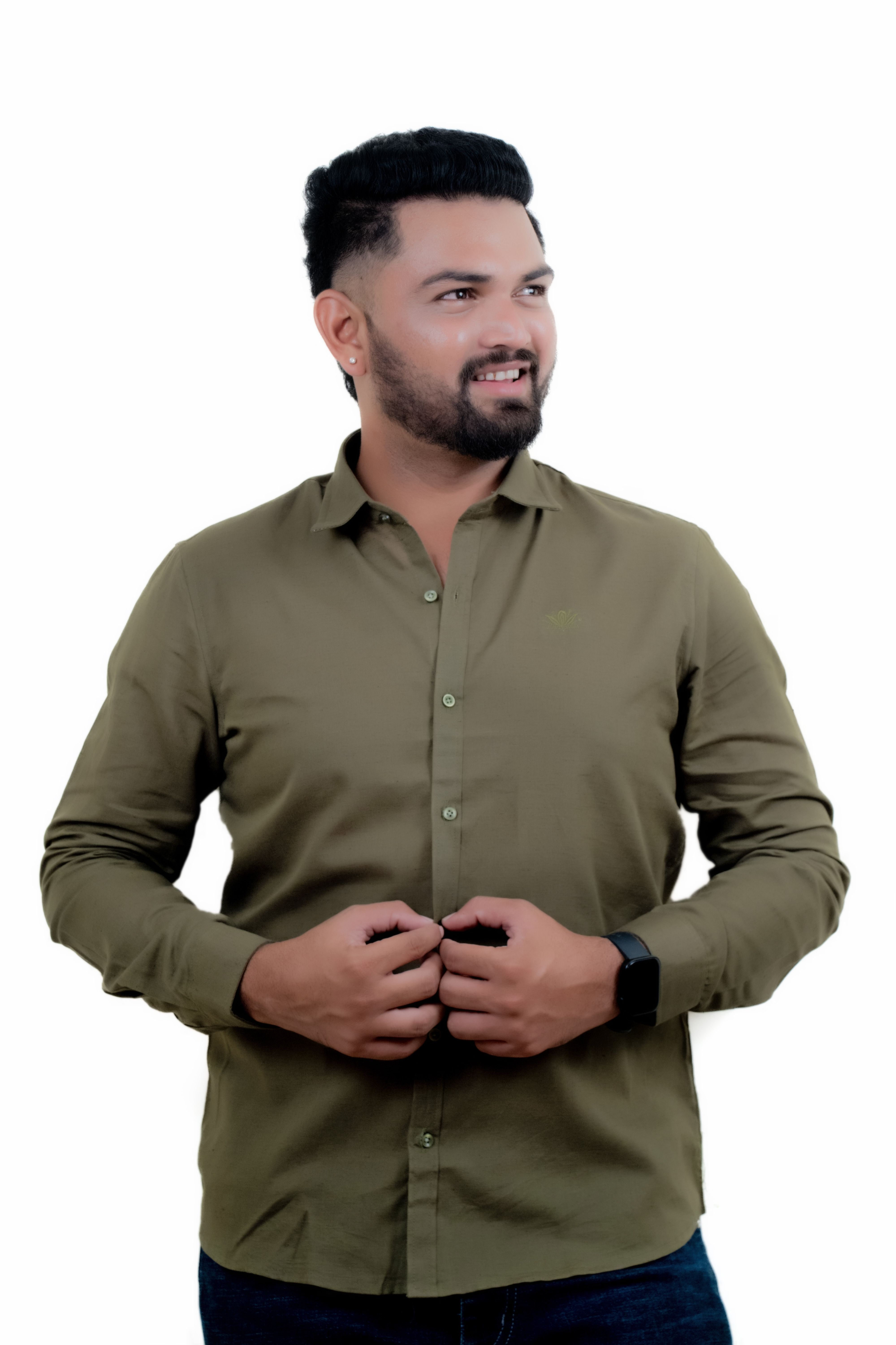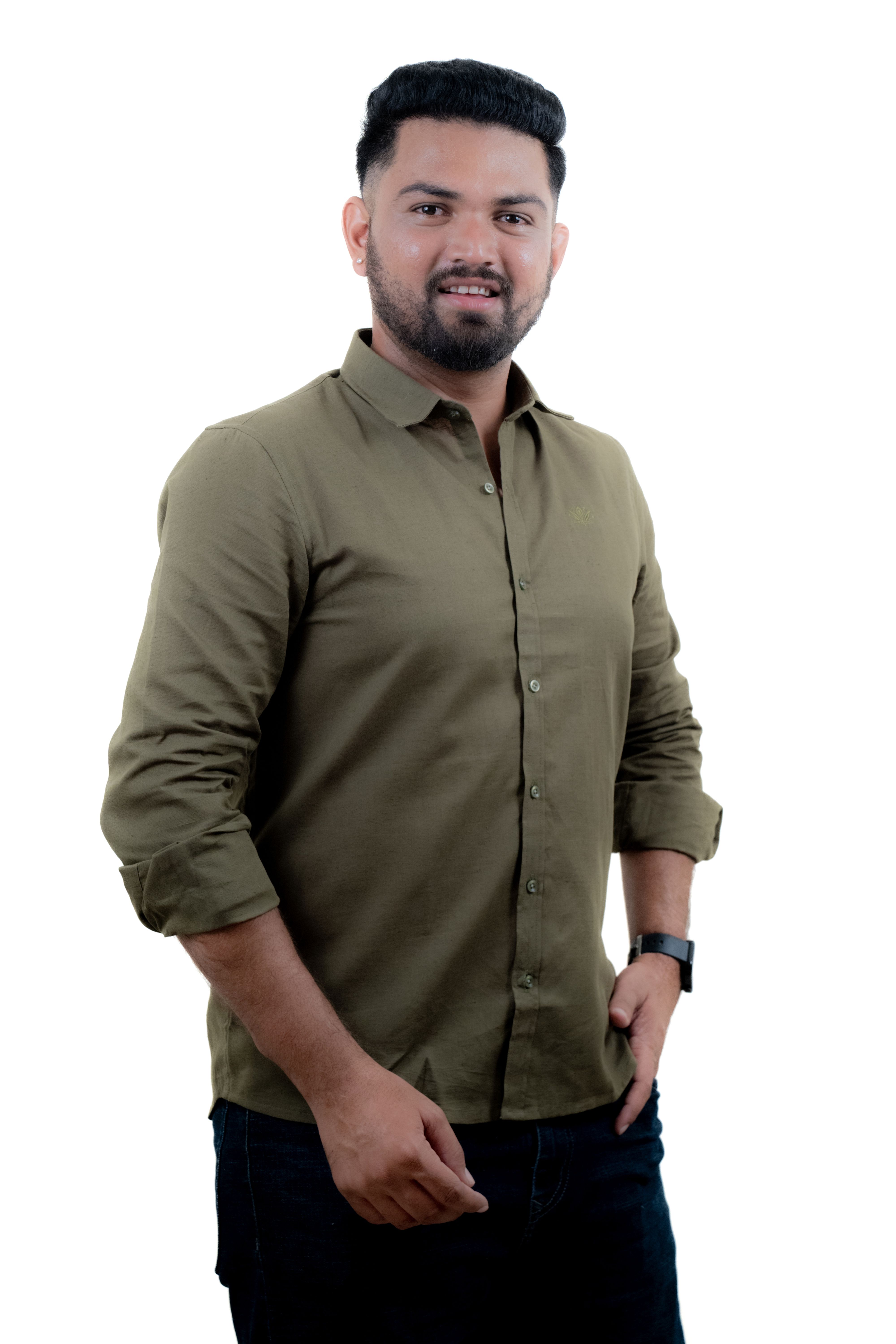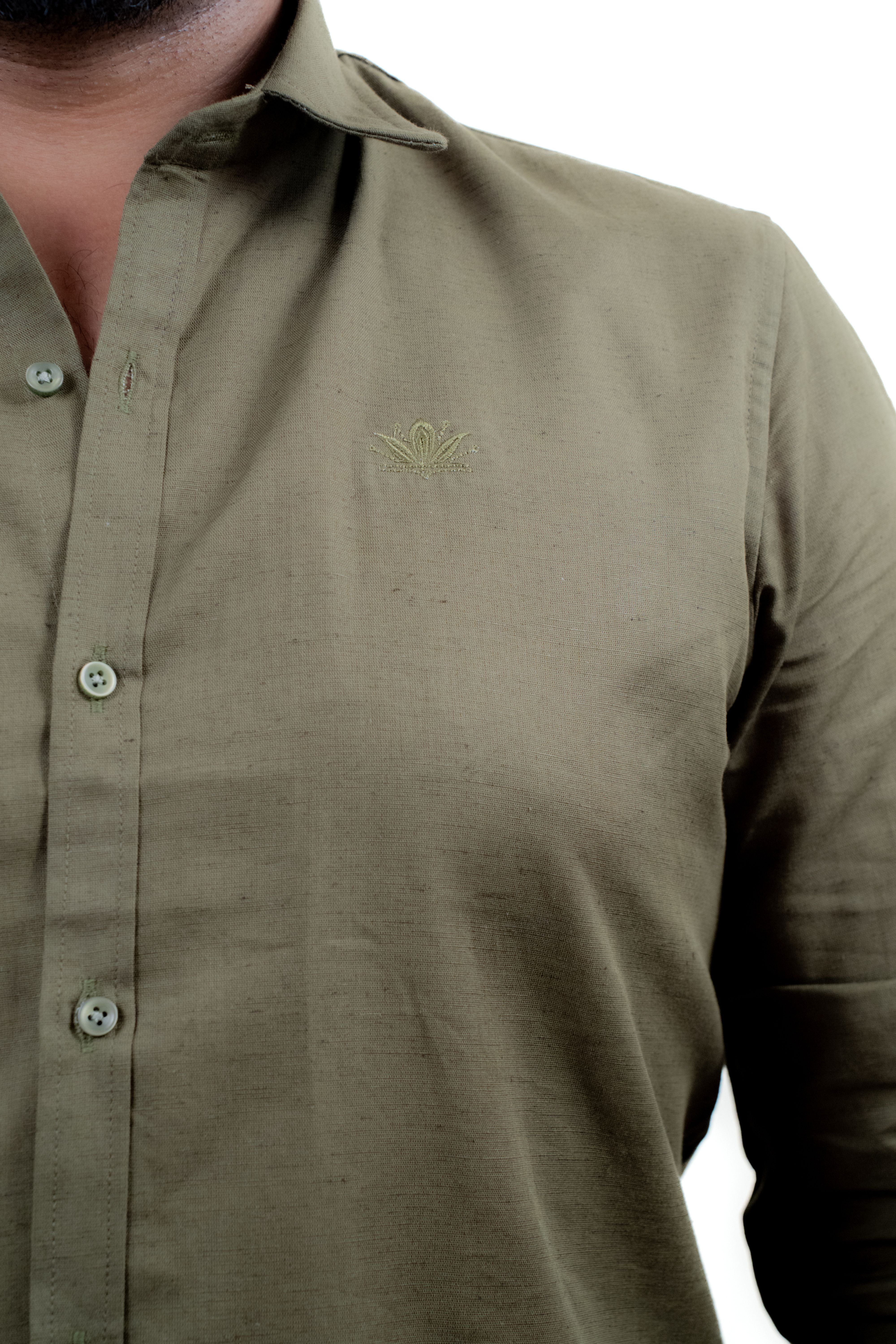 Step up your wardrobe game with this olive green full-sleeve shirt that blends sophistication with a rugged edge. Tailored from a soft, breathable linen fabric, this shirt is designed to keep you comfortable while offering a crisp and clean look. Featuring a classic collar, button-down front, and subtle chest logo embroidery, it’s perfect for office meetings, dinner dates, or casual weekends. The versatile olive tone pairs well with a wide range of bottoms – from denim to chinos – making it a must-have in your style rotation.