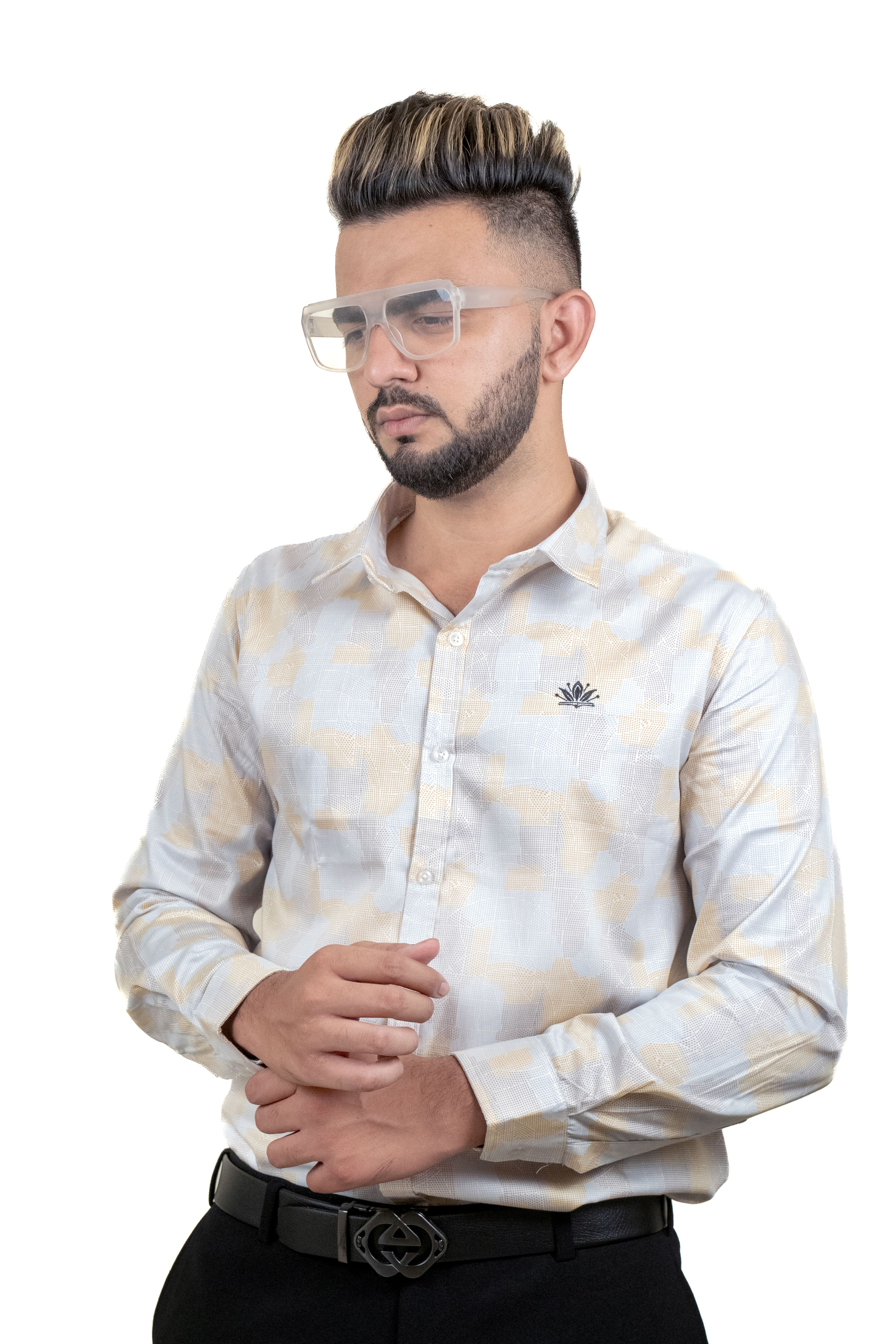 Step into style with this premium full-sleeve shirt from Amogh by HR. Designed with a subtle beige and grey geometric pattern, it features a smart collar, front button closure, and a signature embroidered logo on the chest. Made from high-quality fabric, it offers a soft texture and breathable comfort, making it ideal for all-day wear. Pair it with trousers or chinos for a polished look.