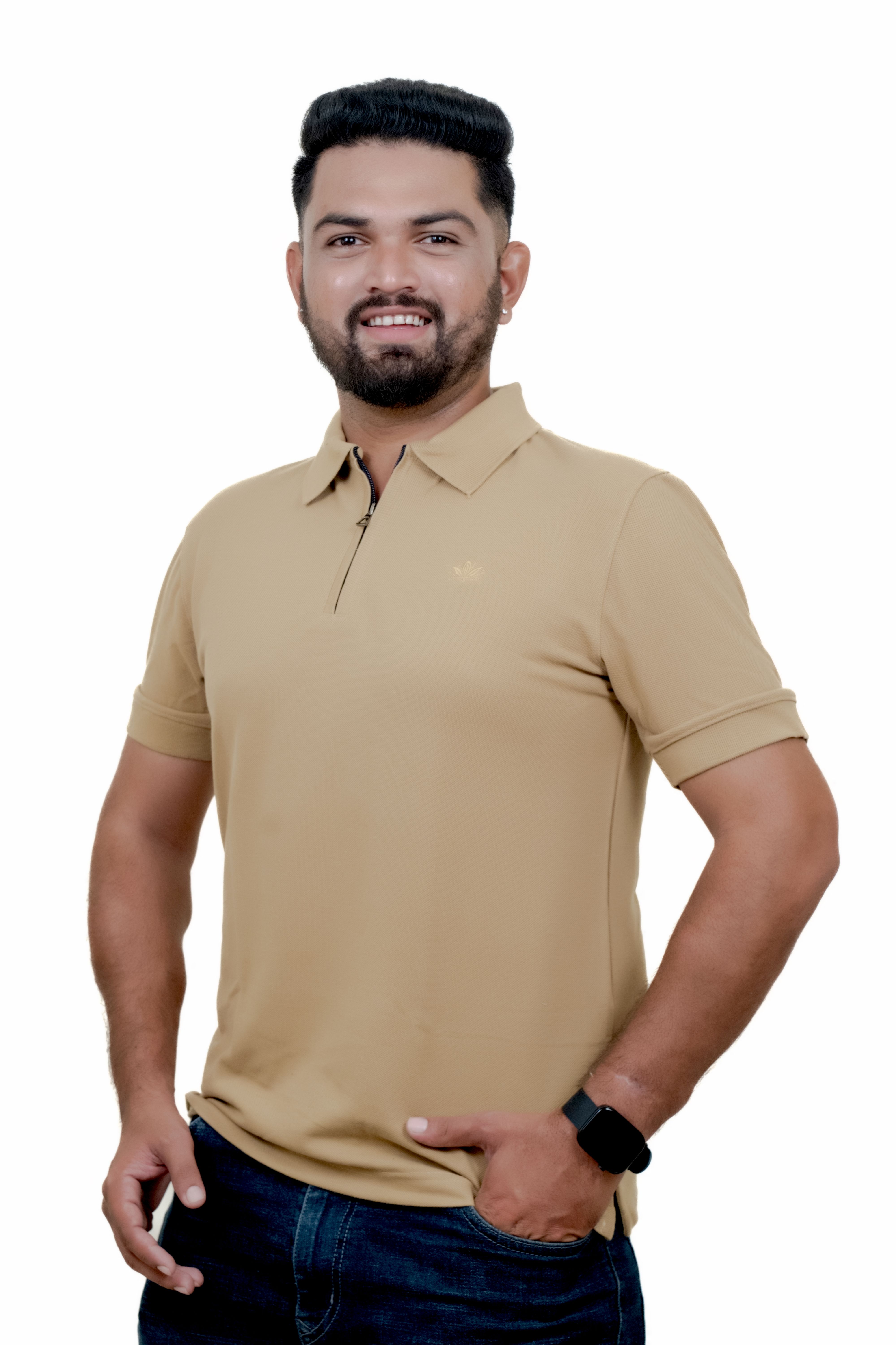 Stay stylish and confident in this camel brown polo t-shirt with a sleek zip collar and classic short sleeves – perfect for everyday wear.
