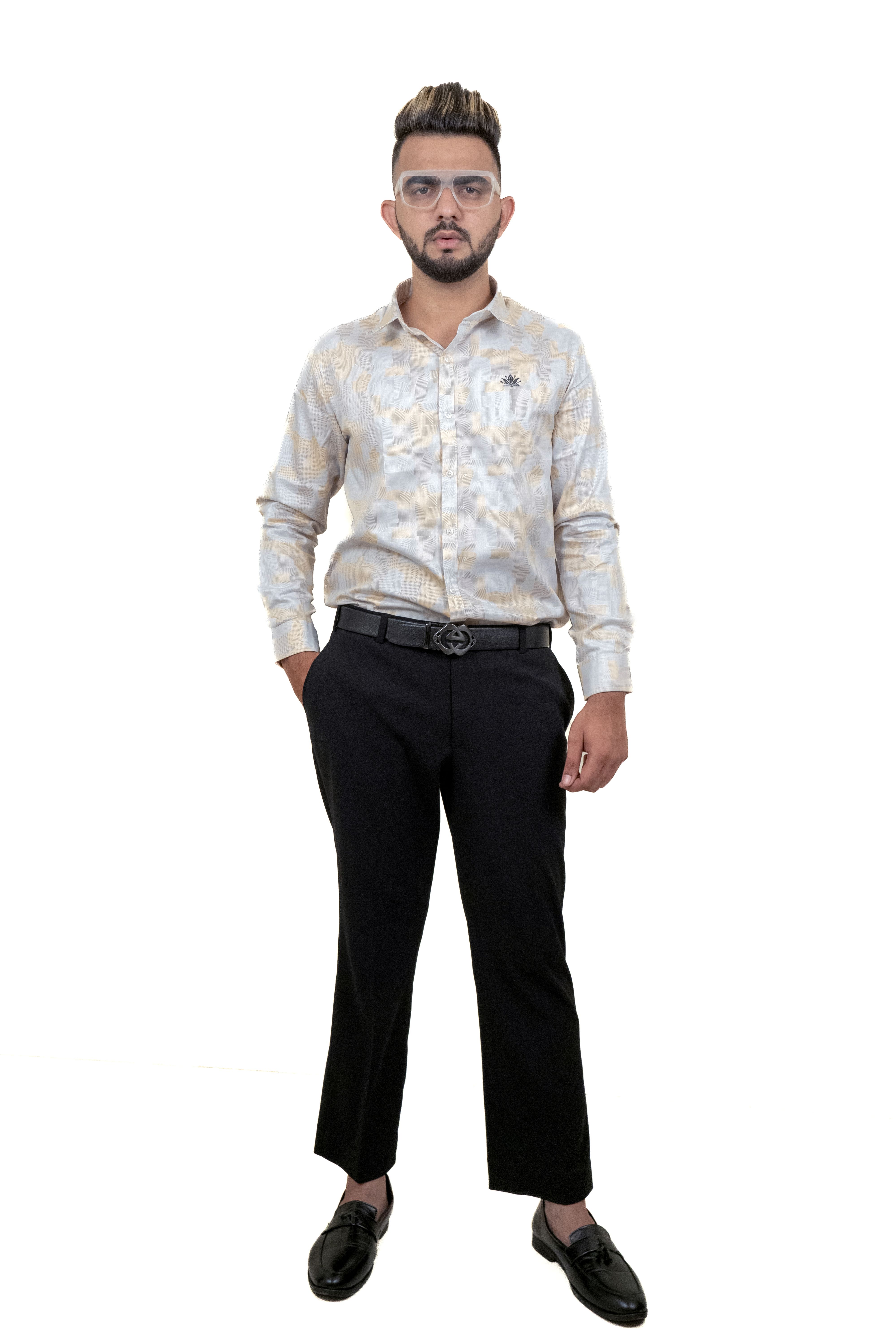 Step into style with this premium full-sleeve shirt from Amogh by HR. Designed with a subtle beige and grey geometric pattern, it features a smart collar, front button closure, and a signature embroidered logo on the chest. Made from high-quality fabric, it offers a soft texture and breathable comfort, making it ideal for all-day wear. Pair it with trousers or chinos for a polished look.