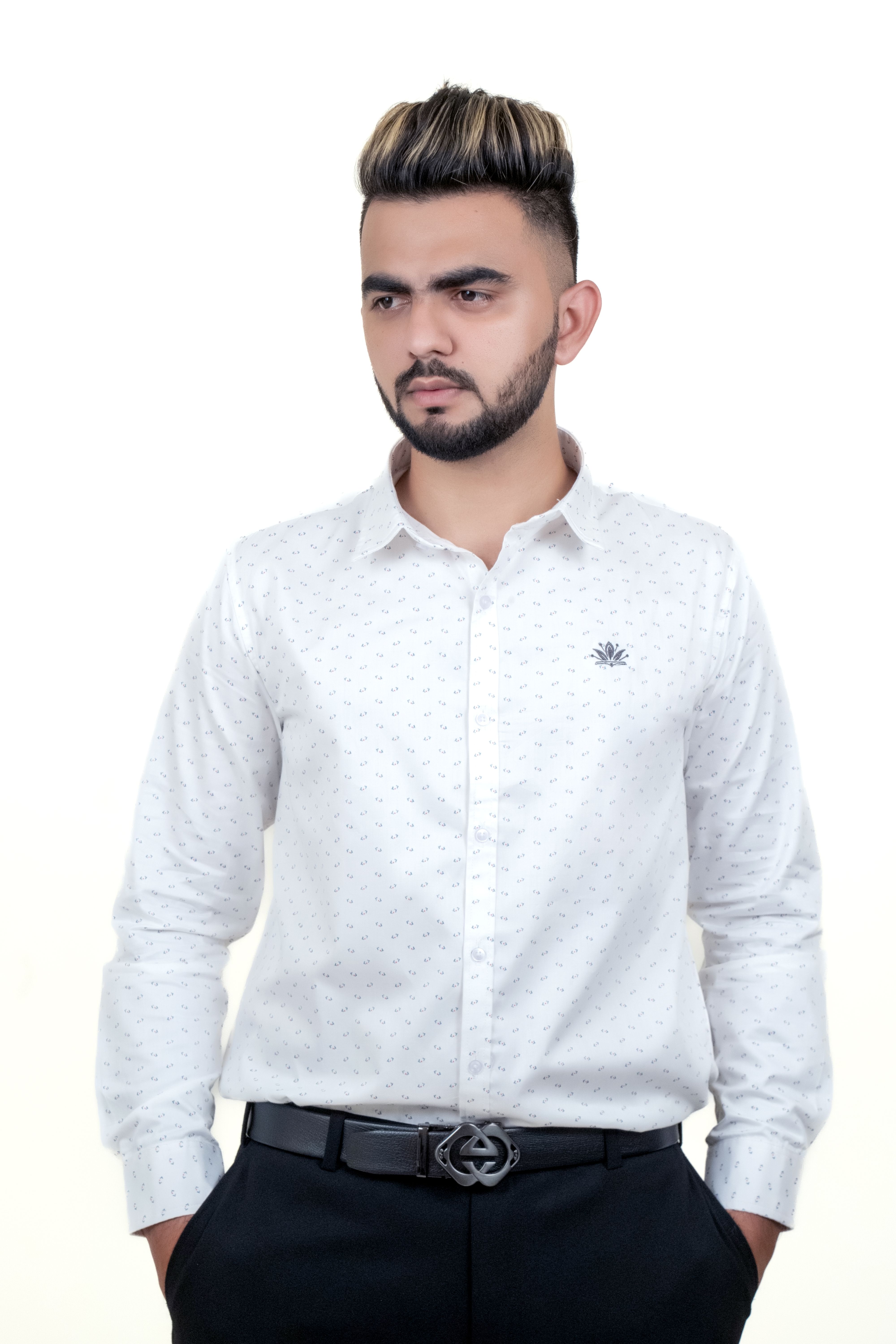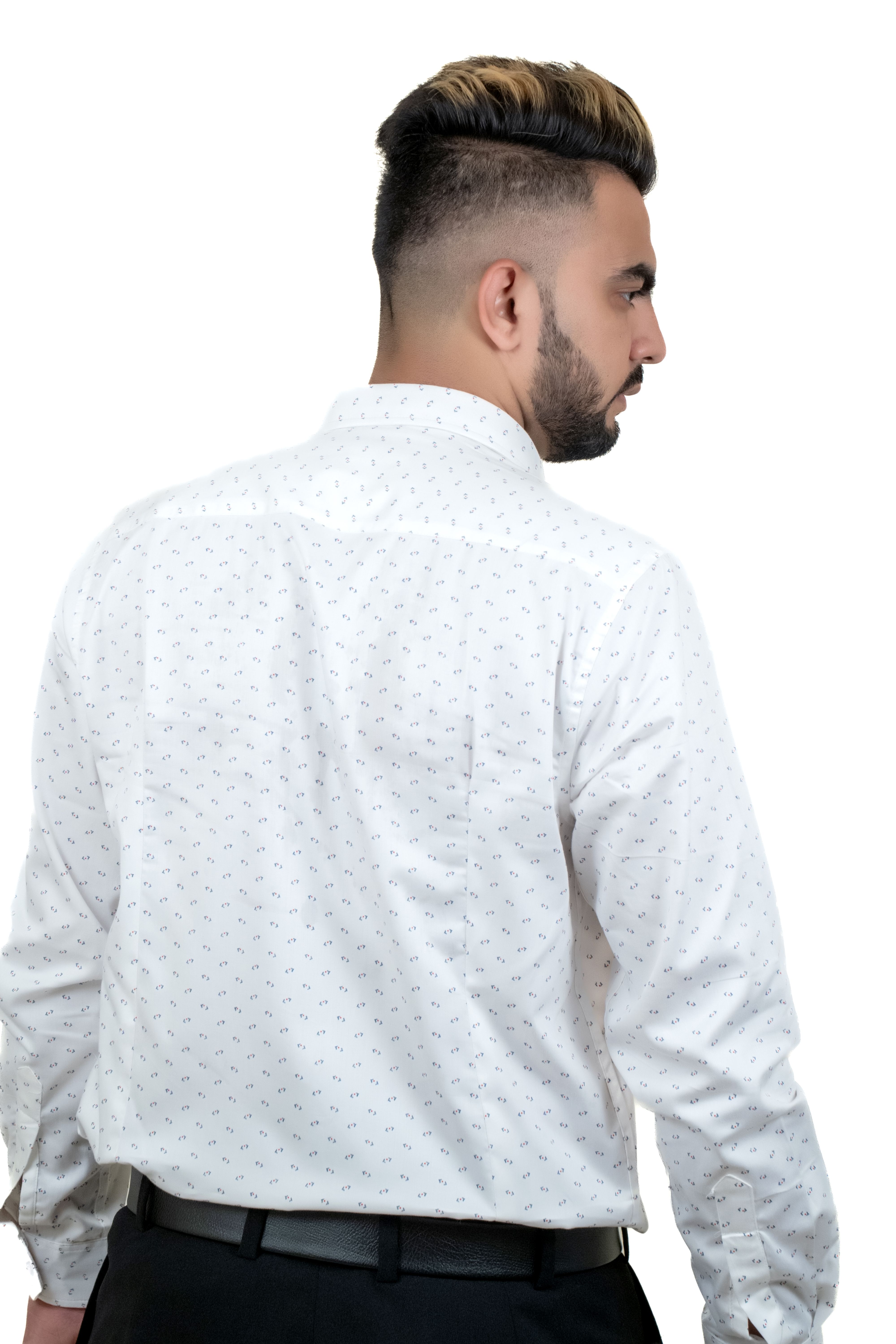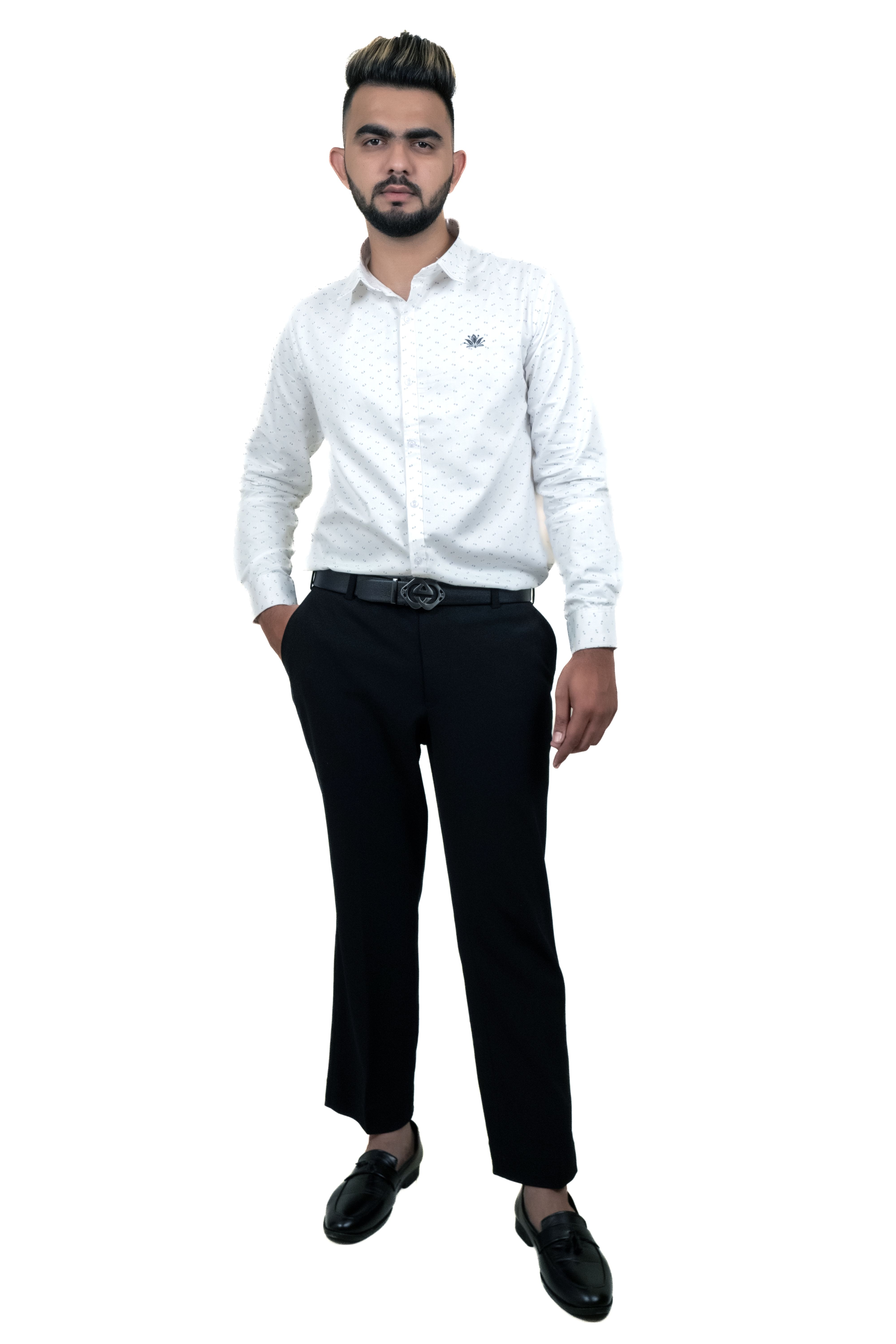 Elevate your wardrobe with this timeless white shirt from Amogh by HR. Crafted with precision, it features a refined all-over micro-dot print, a crisp collar, and an elegant embroidered logo on the chest. Its soft, breathable fabric ensures all-day comfort, while the tailored fit adds a modern touch. A perfect choice for meetings, events, or a polished everyday look.