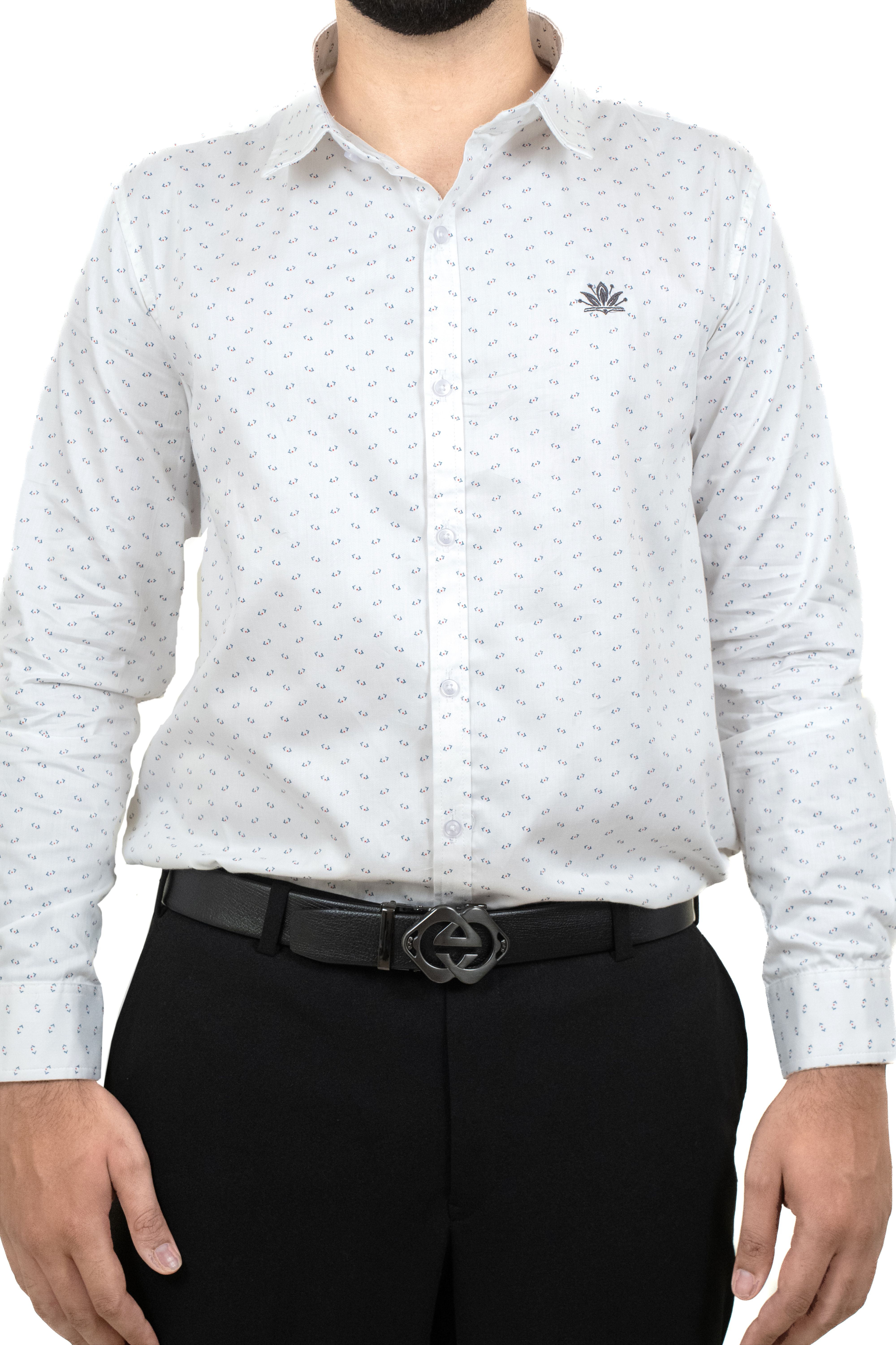 Classic white printed shirt with a subtle micro-dot pattern and elegant logo embroidery — ideal for formal or business casual wear.